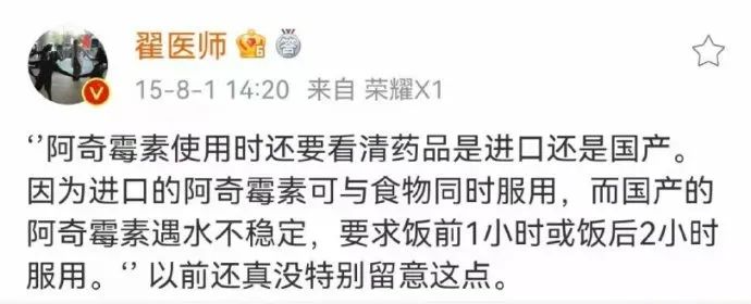 @翟医师:阿奇霉素使用时还要看清药品是进口还是国产。因为进口的阿奇霉素可与食物同时服用,而国产的阿奇霉素遇水不稳定,要求饭前1小时或饭后2小时服用。