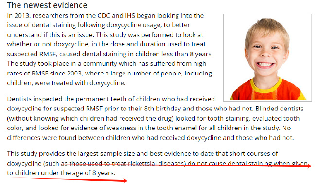 美国疾控中心(CDC):医生通常避免给幼儿开多西环素,因为警告 8 岁以下儿童使用时可能会发生牙齿染色。在最近的一项研究中,美国疾病预防控制中心的专家发现,短期抗生素多西环素可用于儿童,而不会引起牙齿染色或牙釉质变弱。这项研究提供了迄今为止最大的样本量和最佳证据,证明短疗程的多西环素(例如用于治疗立克次体病的多西环素)在给 8 岁以下儿童服用时不会引起牙齿染色。链接:https://www.cdc.gov/rmsf/doxycycline/index.html