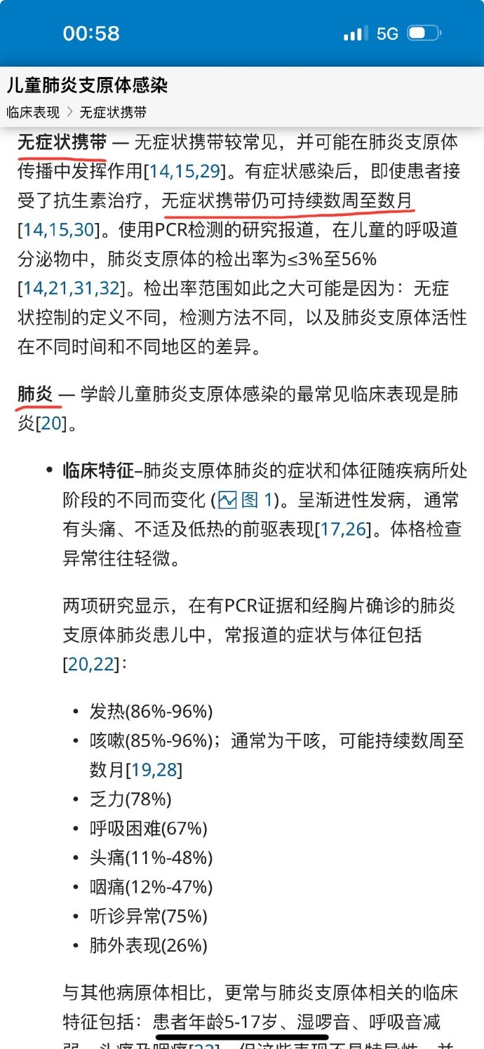 @罗百竹:儿童不会在短期内(数月至数年)反复感染肺炎支原体。儿童感染支原体后只是没有持久的保护力,并非没有保护力(人体的支原体抗体也不是吃素的)。此外,支原体的无症状感染似乎常见,并且在有症状感染后可能出现长期携带。急性感染后,支原体的无症状携带可持续数周至数月,中位持续时间约为7周。换言之,在大约7周范围内(可能更短或者更长),这些儿童体内依然还有支原体啊!根本就不需要别人感染,体内就有支原体,但是不会发病!其实可以合理预测——儿童感染一次支原体后,一般在数月至数年都不会再感染!这既和孩子的免疫有关,也和病原体的流行规律有关。微博链接:https://weibo.com/1990821721/Nr4tJjDps
