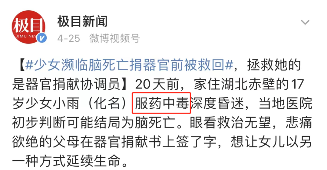 前几个月,湖北17岁女孩就因服用一整瓶药物后陷入深度昏迷,心跳骤停。