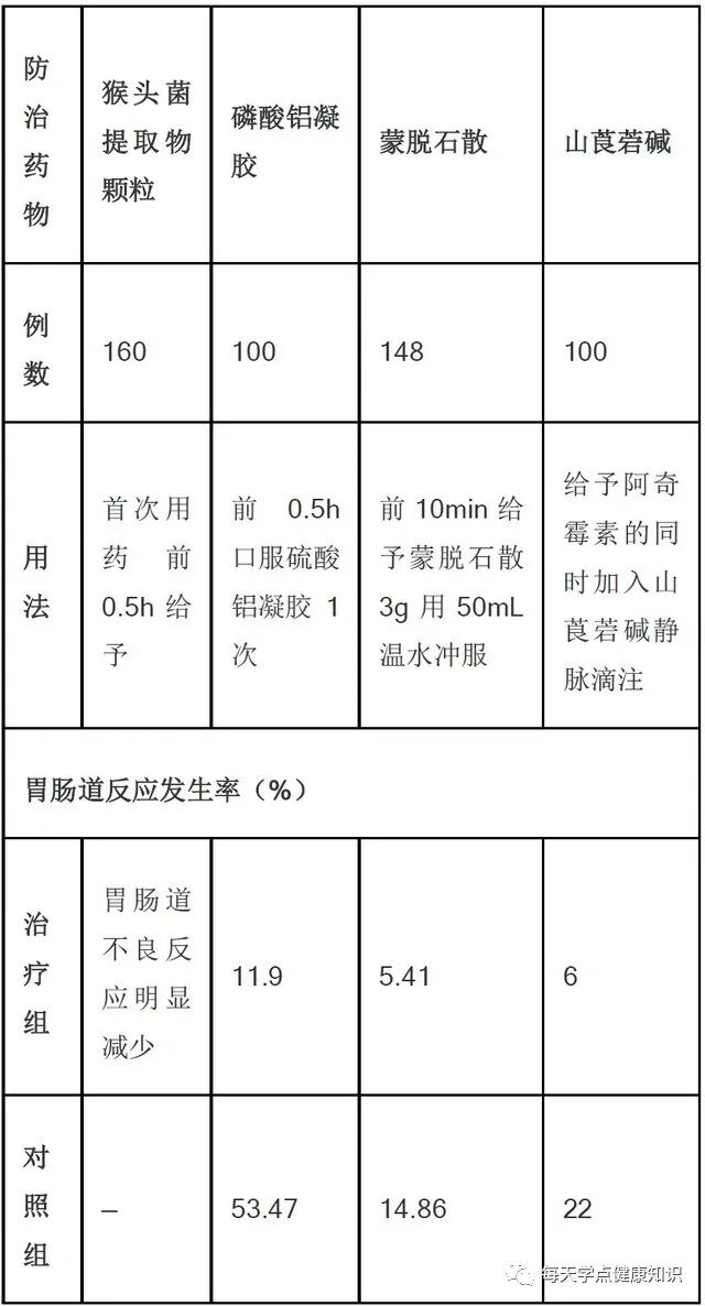 近年来,有多项研究发现:以下几种药物可有效预防阿奇霉素引起的胃肠道反应(见下表)。