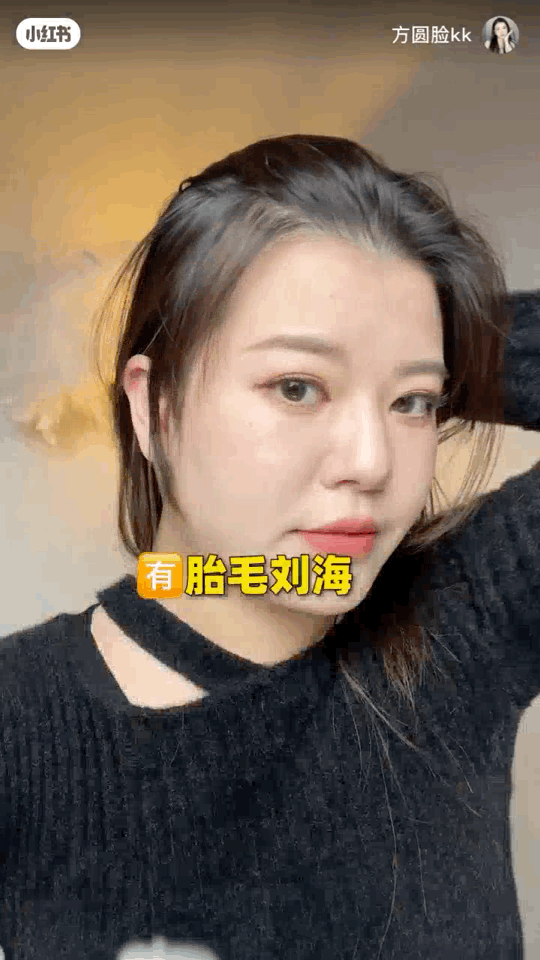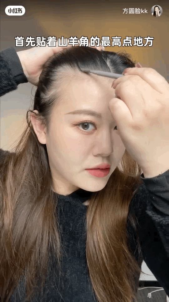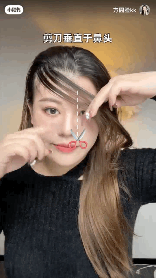 在额角处选取超薄的一层头发,拽紧,拉到对侧的眉头处 。用剪刀纵向剪掉,然后就会有个自然的弧度👇。