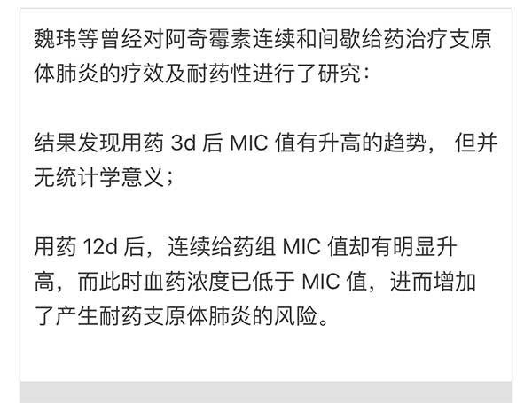 由于肺炎支原体肺炎具有较长病程,通常可持续 3 周时间,甚至更长。并且阿奇霉素的胃肠道反应和用药时间成正相关。