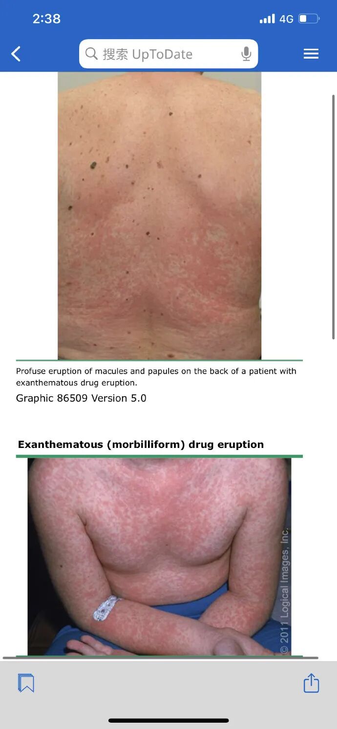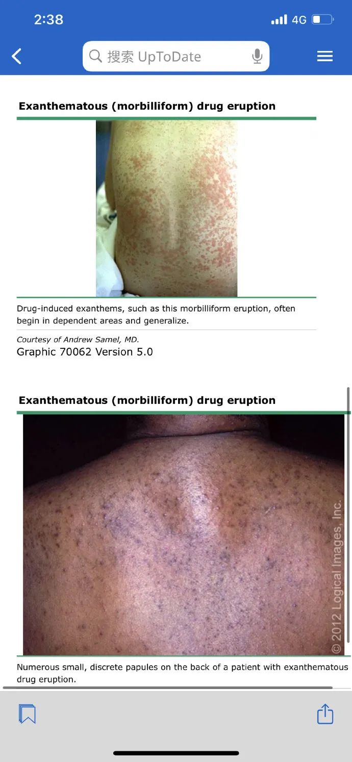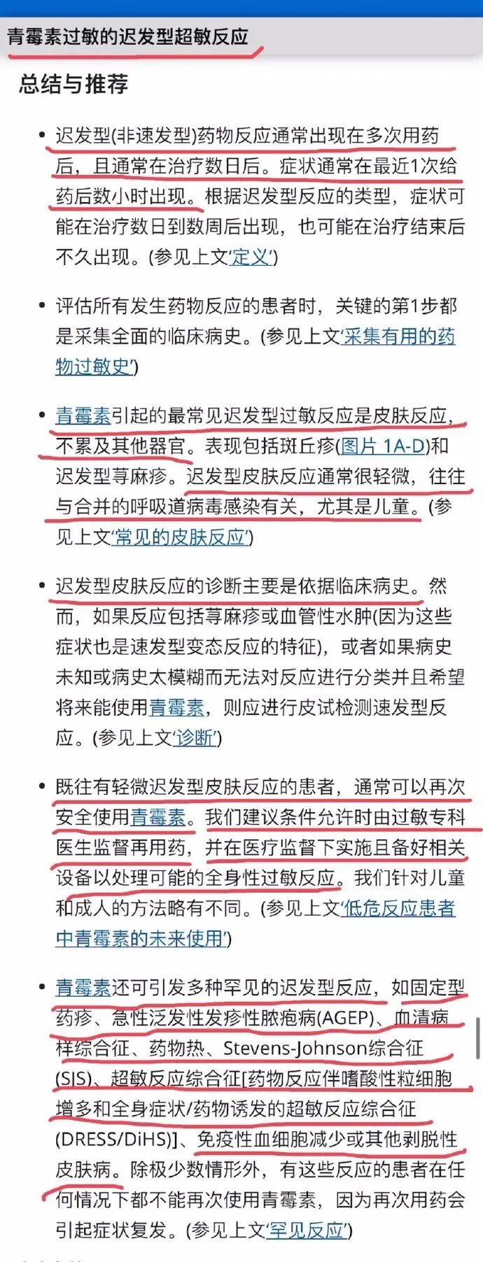 UpToDate临床顾问:青霉素过敏的迟发型超敏反应。迟发型(非速发型)药物反应通常出现在多次用药后,且通常在治疗数日后。症状通常在最近1次给药后数小时出现。根据迟发型反应的类型,症状可能在治疗数日到数周后出现,也可能在治疗结束后不久出现。