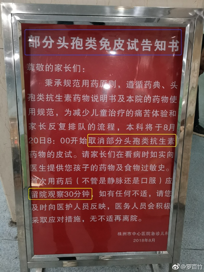 @罗百竹:健康群里宝妈发来一张株洲中心医院急诊儿科的《部分头孢类免皮试告知书》,这个医院取消了部分头孢类抗生素的皮试,但是要求家长如实提供孩子的药物和食物过敏史以及严格要求用药后留院观察30分钟。要为这个医院点赞!@翟医师 和 @医生魏玮 以前都提醒过:头孢菌素针剂做皮试也是胡闹,皮试对过敏性休克的识别毫无意义,国外主流都不做头孢皮试,国内药典也没有皮试规定。(2018-11-14)