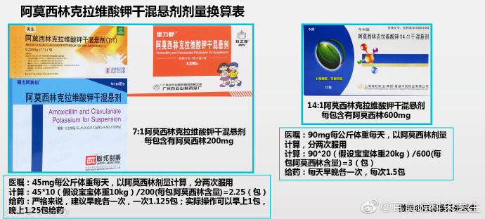 @耳鼻喉科朱医生(卓正医疗朱伟栋医生) :阿莫西林克拉维酸钾干混悬剂如果需要用到大剂量每天90mg/kg,最好用14:1的今利辰,这样克拉维酸钾剂量不会超标。详细方法:https://weibo.com/1628507870/Jpv4y4jOi
