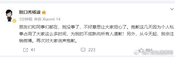新浪微博上也能看到下面截图:朋友们和同事们都在,我没事了,不好意思让大家担心了。抱歉这几天因为个人私事占用了大家这么多时间,为我的不成熟向所有人道歉!另外,从今天起,我会注销微博。再次对大家说声抱歉。我在微博搜索@脱口秀杨波,发现的确已经搜不到他的微博账号了,疑似已经注销了。