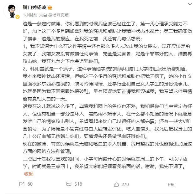 2024年2月4日,脱口秀演员杨波再度回应出轨风波,文章开头留下一句这是一条定时微博,你们看到的时候我应该已经往生了... 疑似轻生。
