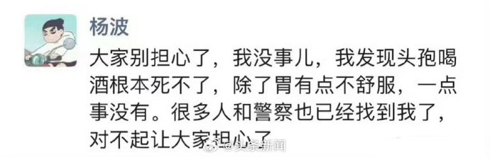 据@搜狐娱乐 报道:2月4日下午,@脱口秀杨波 已经在朋友圈回应疑似轻生一事:大家别担心了,我没事儿,我发现头抱喝酒根本死不了,除了胃有点不舒服,一点事没有。很多人和警察也已经找到我了,对不起让大家担心了。