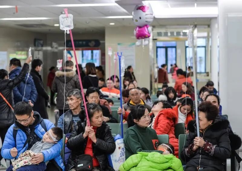 某儿科诊所门前,挤满吊针中的孩子及其家长