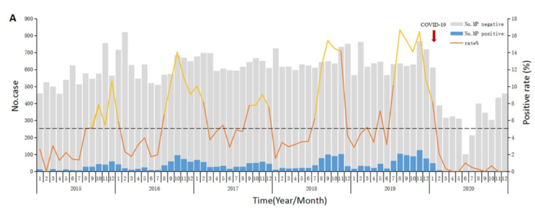 (图源:Wang, X., Li, M., Luo, M., Luo, Q., Kang, L., Xie, H., ... & Gong, C. (2022). Mycoplasma pneumoniae triggers pneumonia epidemic in autumn and winter in Beijing: a multicentre, population-based epidemiological study between 2015 and 2020. Emerging Microbes & Infections, 11(1), 1508-1517.)