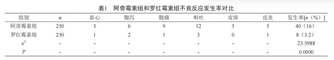 下图是某院以回顾性收集分析的方式收集2016年1月~2017年1月在本院进行治疗的500患者作为本次调查的对象,其中有250例患者使用罗红霉素进行治疗,另外250例患者使用阿奇霉素进行治疗。将使用阿奇霉素进行治疗的患者作为阿奇霉素组,将使用罗红霉素进行治疗的患者作为罗红霉素组[1]。在这里借用一下相关数据。