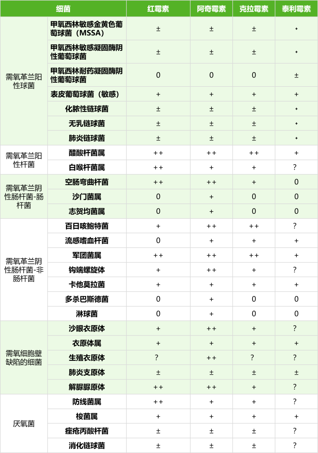 注:MSSA 为甲氧西林敏感金黄色葡萄球菌;MASR 为耐甲氧西林金黄色葡萄球菌;MSSE 为甲氧西林敏感表皮葡萄球菌;MRSE 为耐甲氧西林表皮葡萄球菌。++ 推荐;+ 有活性、备选药物;± 不确定(抗菌活性不明确);0 无活性(抗菌活性不佳);?数据不充分,无充分数据推荐使用。
