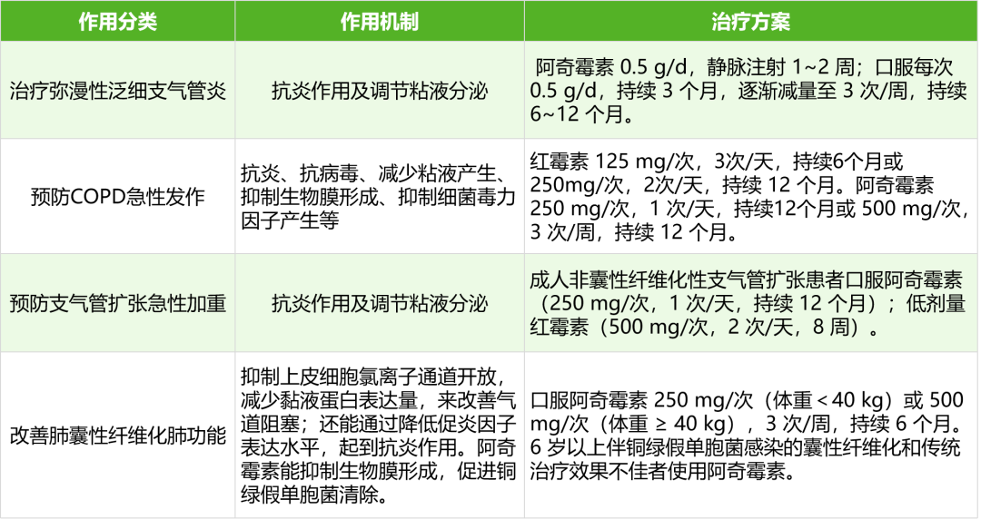 大环内酯类抗菌药物可抑制炎症细胞、细胞因子和炎症介质,发挥抗炎作用,在慢性气道炎症及弥漫性泛细支气管炎等疾病的气道炎症反应和重构等环节发挥重要作用。