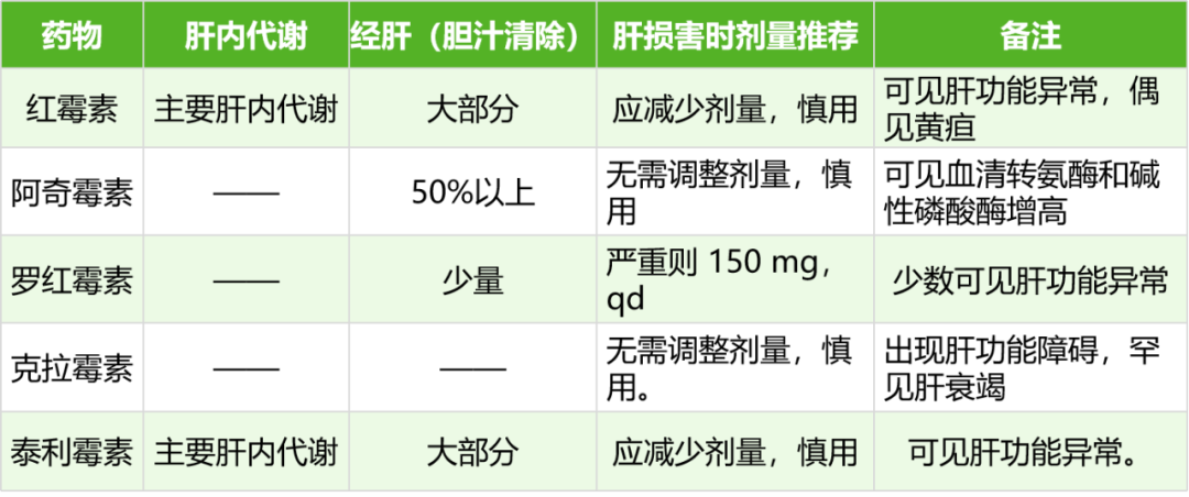 大环内酯类抗菌药物主要经肝脏清除,肝功能减退时药物清除减少,但并无明显的毒性反应发生,肝病时仍可正常应用,但需谨慎,必要时减量给药,治疗过程需严密监测肝功能。