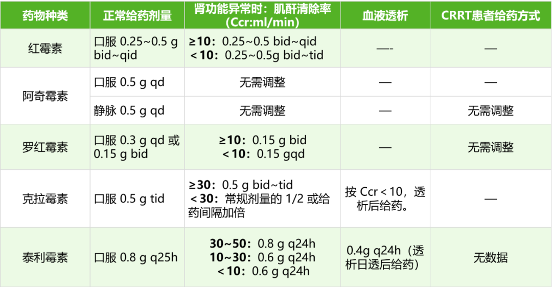 大环内酯类抗菌药物主要经胆汁排泄,在轻中度肾功能不全时,一般无需调整给药剂量,在重度肾功能不全可能需要减少给药剂量。但阿奇霉素在肾功能不全时无需减量,适用于肾功能不全的患者。