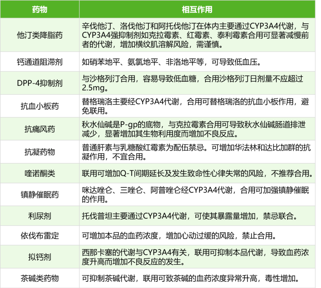 大环内酯类(除阿奇霉素、罗红霉素外)如克拉霉素、红霉素、泰利霉素通常对 CYP3A4 和 P-gp 有较强的抑制作用,与以下药物使用,需注意。