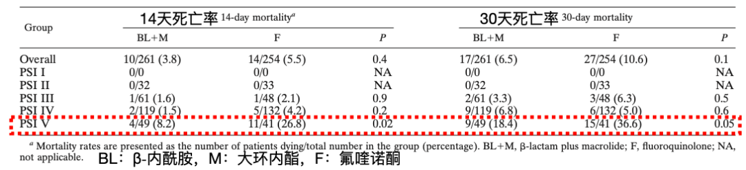 2.有回顾性研究比较了β-内酰胺+大环内酯联合与氟喹诺酮单药的疗效,结果发现对于肺炎严重指数(PSI)V 级的患者,β-内酰胺+大环内酯联合组的 14 天与 30 天死亡率明显较低(详见下表)。