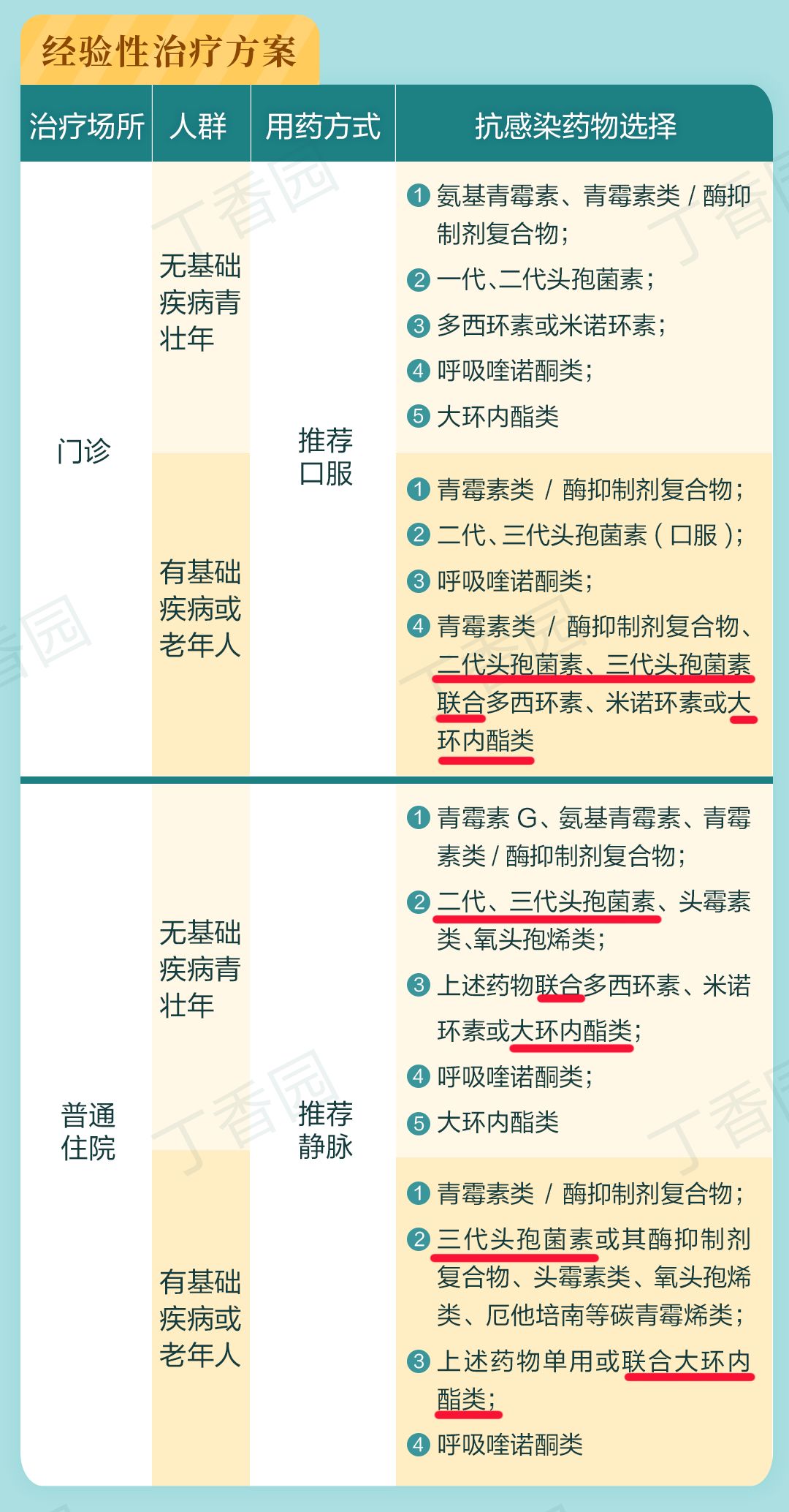 β-内酰胺类(氨苄西林/舒巴坦、头孢噻肟、头孢曲松或头孢洛啉)联合大环内酯类(强推荐,高质量证据);