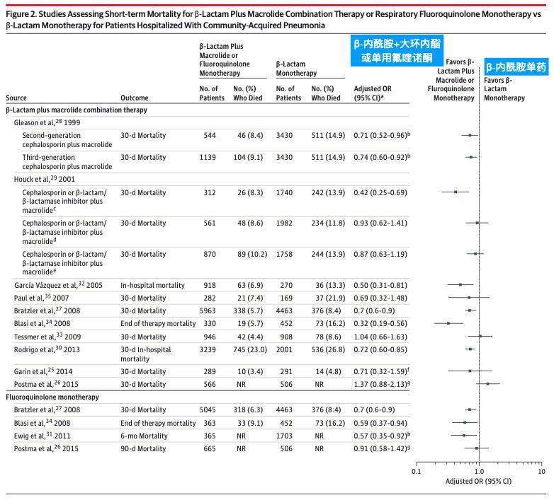1.2016 年 JAMA 发表了一篇系统回顾,发现成人住院 CAP 予β-内酰胺联合大环内酯或单用氟喹诺酮类伴更低的短期死亡率(详见下图)。