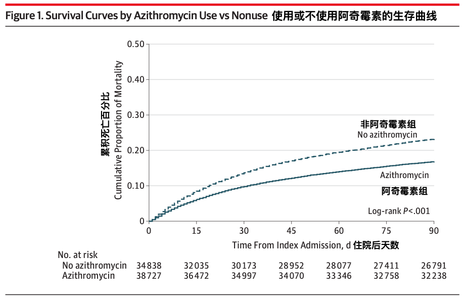 4.2014 年 JAMA 有研究采集了 2002 年~2012 年美国退伍军人事务数据库的相关数据,共收集到来自 118 家医院的 73690 例老年肺炎病例,结果发现对于老年肺炎住院患者,阿奇霉素治疗较其它抗生素治疗的 90 天死亡率更低(详见下图)。