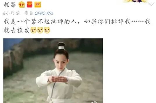 还记得17年的时候,她在《三生三世十里桃花》的一个扮相就被吐槽过发际线太高。当时,向来敢于自黑的杨幂发还笑称:我是一个禁不起批评的人,如果你们批评我……我就去植发。