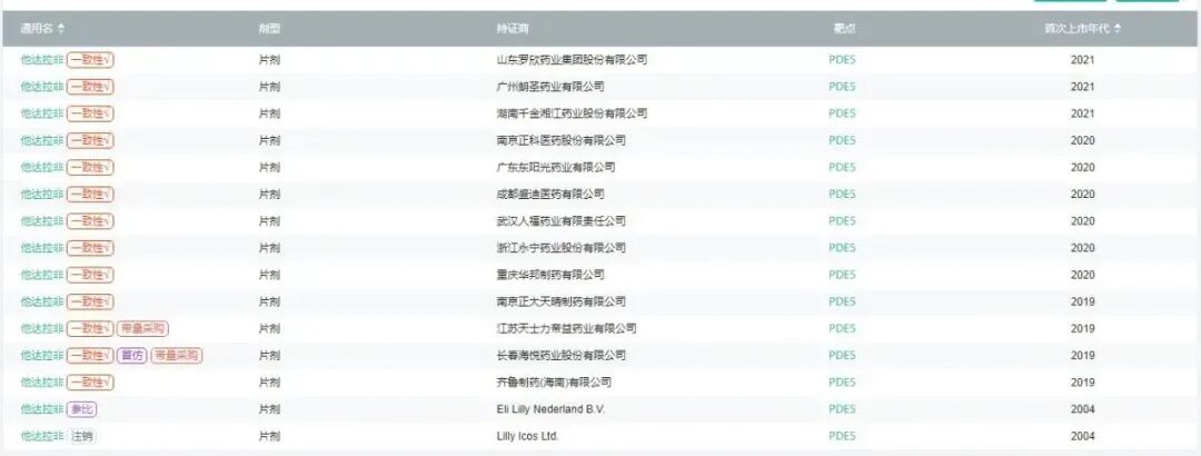 目前国内获批上市的他达拉非企业(图片来源:医药魔方PharmaGO数据库)