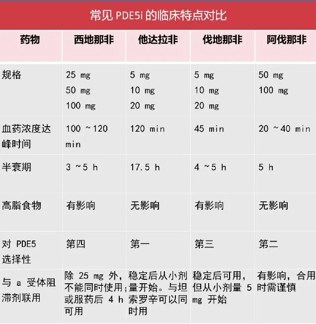 PDE5i 治疗取得成功的关键在于为患者提供合理的用药质询和指导,包括药物起效的时间和空腹服用。常见 PDE5i 的临床特点对比详见表 2。