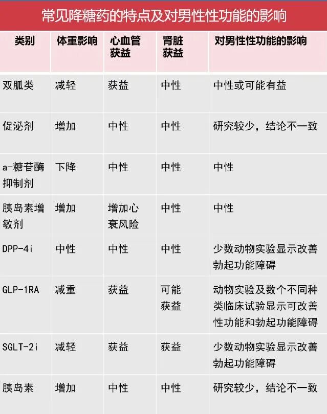 对于合并男性性功能障碍患者,应在有效控制血糖前提下,根据不同机制降糖药物的代谢特点和副作用,选择和使用对生殖系统具有保护作用,或副作用小的药物。常见降糖药物的特点及对男性功能的影响详见表 1。
