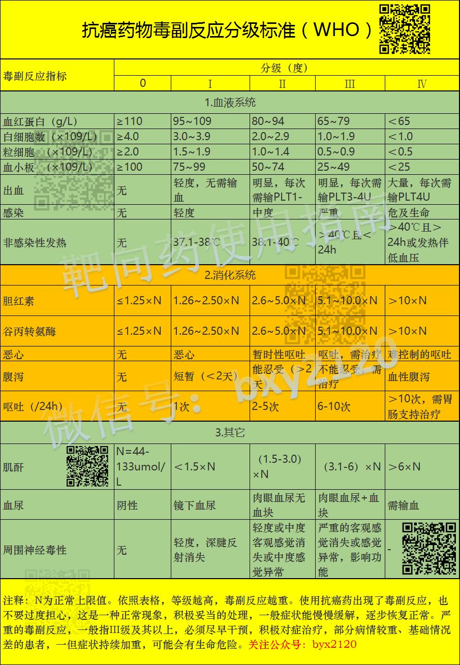 依照上述表格,等级越高,副反应越重。出现了毒副反应,也不要过度担心,这是一种正常现象,是药三分毒,只要积极妥当的处理,一般症状能慢慢缓解,逐步恢复正常。严重的毒副反应,一般指III级及其以上,必须尽早干预,积极对症治疗,部分病情较重、基础情况差的患者,一但症状持续加重,可能会有生命危险。此时,我们需要家属理解与积极配合,同专业的医生一起,风雨同舟,我们共抗病魔。