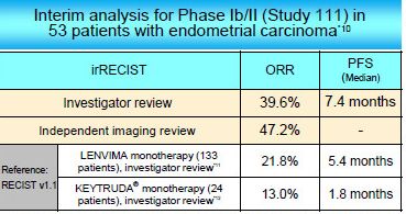 2018年ASCO上报道了该试验,为Ib/II期。纳入了53例晚期子宫内膜癌患者,接受乐伐替尼20mg/天+Keytruda 200mg/3周治疗。