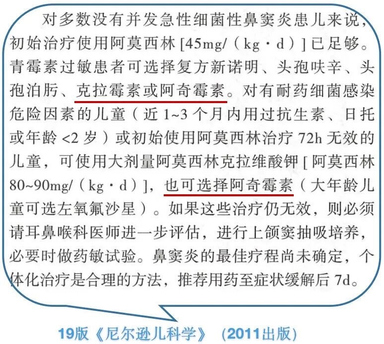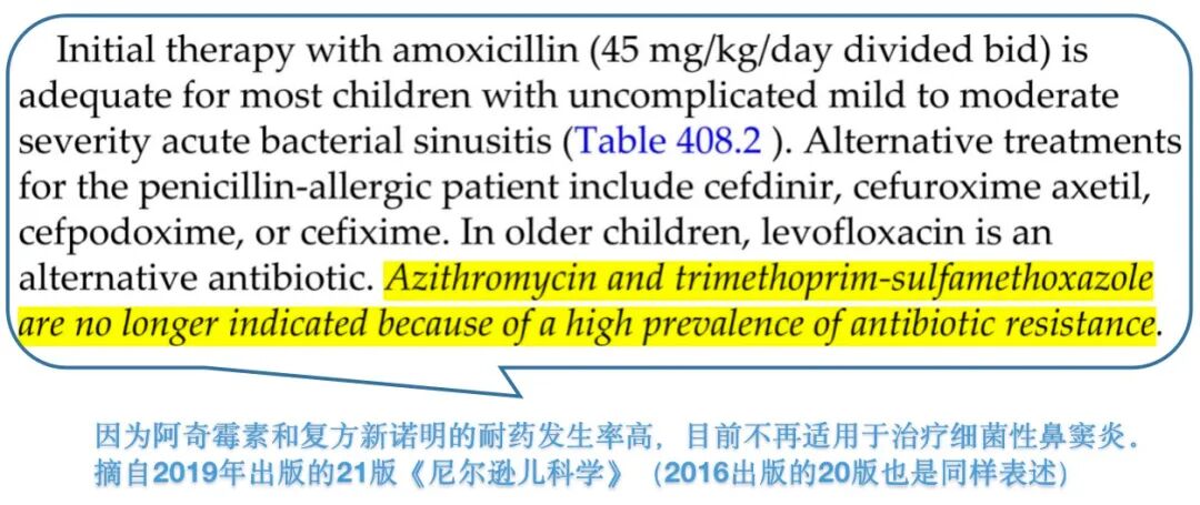 如,19版《尼尔逊儿科学》(2011年原版发行,2017年出其中译版)把阿奇霉素作为治疗细菌性鼻窦炎的备选(下图)。