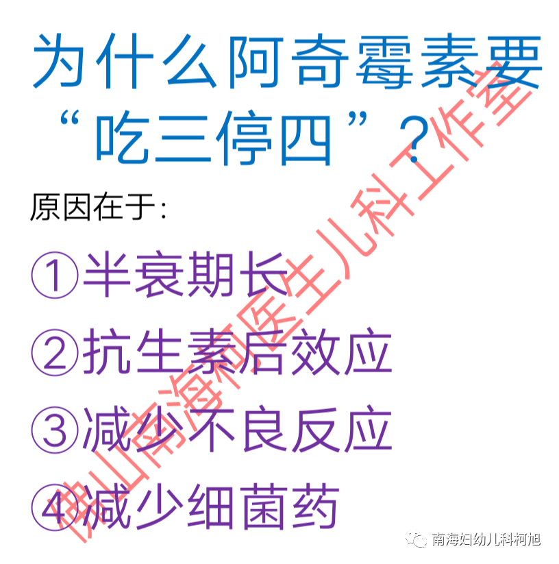 ①、阿奇霉素的半衰期很长,单剂给药后在不同组织的消除半衰期为35~60小时。因此,即使服药3天后停用,阿奇霉素依然能在孩子体内持续作用3~4天。