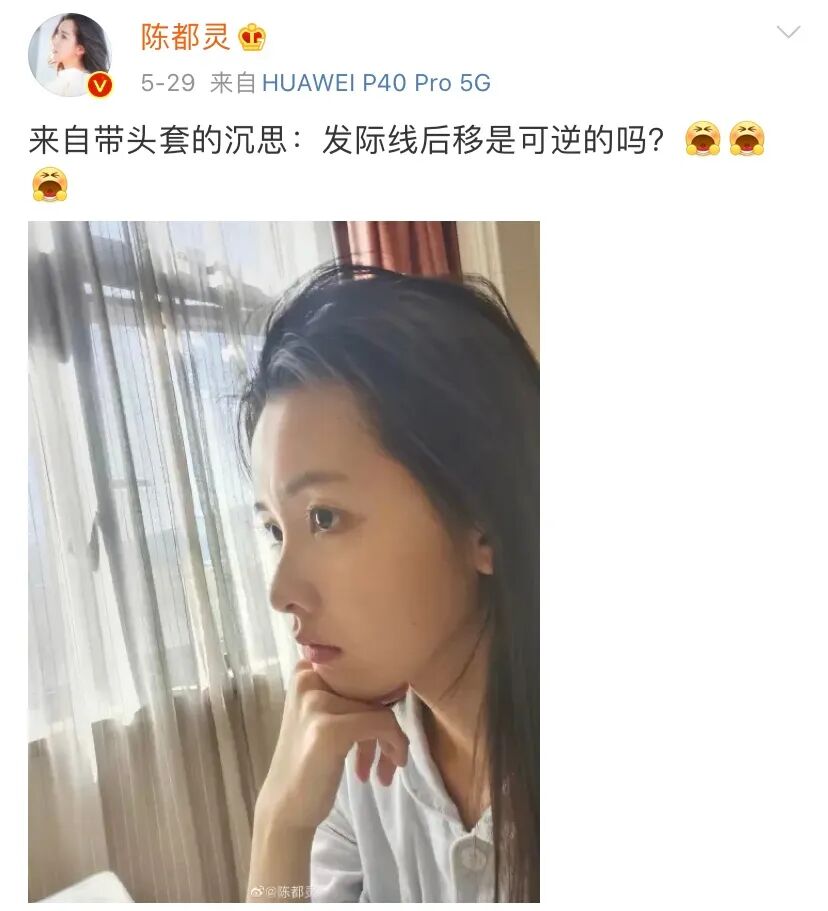 前几日陈都灵发博感叹,自己在拍《良辰好景知几何》的时候戴头套,导致发际线后移了不少。