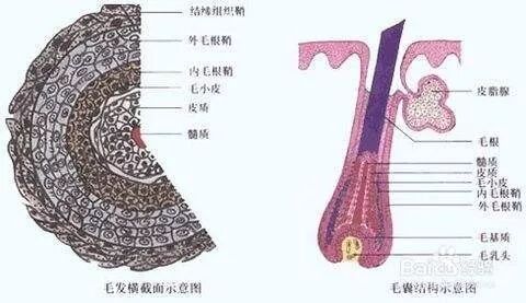 皮质层是由角蛋白组成,中间的颜色沉淀决定了头发颜色