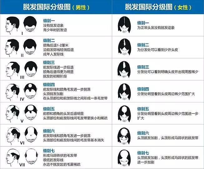 脱发根据严重程度,也可以分为不同的阶段,有脱发的朋友可以对着表看看自己属于哪个级别。