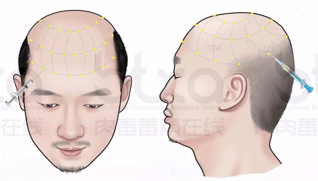 最后一个方法,就是今天的主角,也就是——通过特定部位的肉毒毒素注射,达到防脱发的效果。