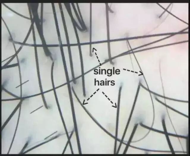 而正常情况下,单个健康毛囊可以长出3到4根头发,正常的掉发是毛囊休止期造成的,所以同个毛囊长出的头发会一起脱落。而脱发是毛囊生发能力下降,出现脱发也是一根一根掉发,所以脱发者会出现单个毛囊仅有一两根头发的现象,因此,观察发根处单个毛囊内长出毛发数量,也可以判断。