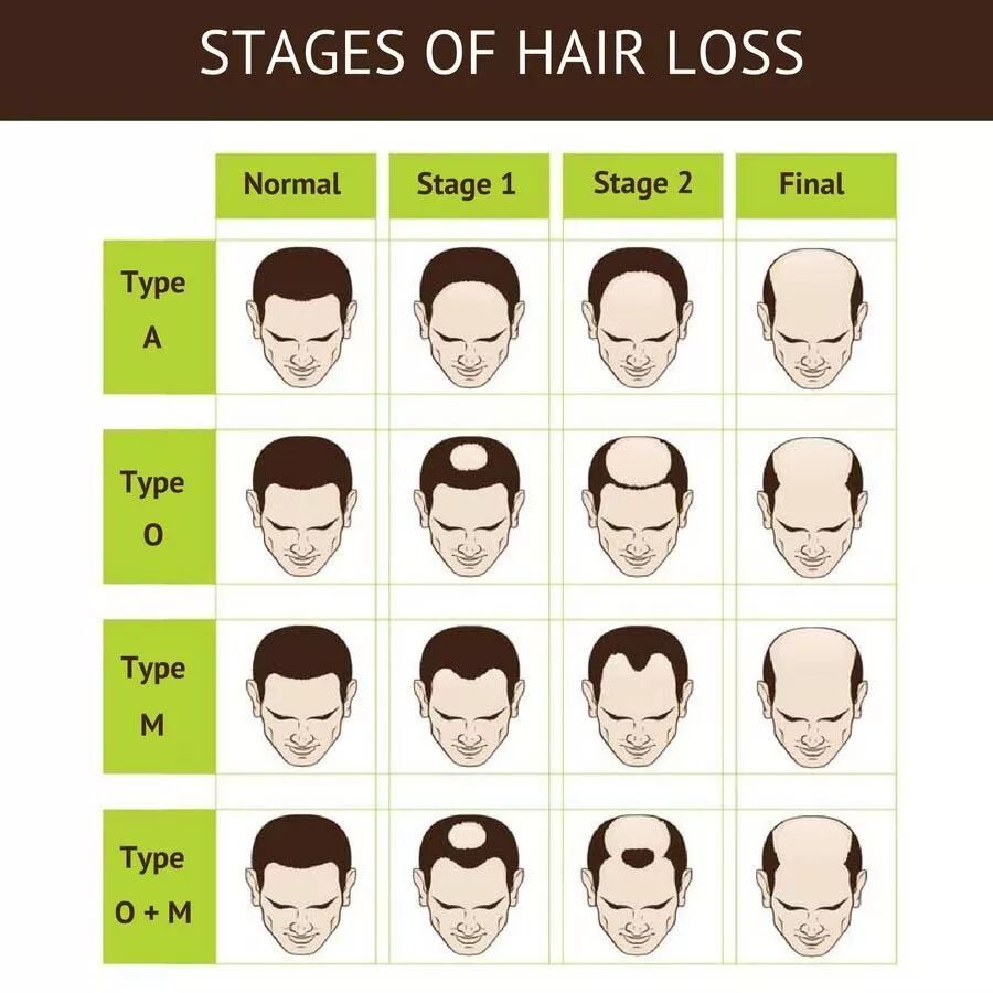 这种情况,一开始并没有显著表现,但到了25-30岁,通常就能明显的注意到脱发的后果——逐渐的就开始出现发际线后移,或者头顶处毛发稀疏,呈现M型的前额或O型的头顶,更有甚者,M+O。至于为什么是这种形态,或者说为什么通常从头顶和发际线两侧开始秃,其实目前科学界也并没有明确的解释。(比较流行的说法是头顶部位头皮DHT浓度高、5α还原酶活性高)