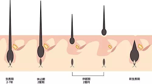 其实,毛发的生长和脱落呈现周期性。分为三期:生长期、退行期及休止期。正常情况下,大约90%-95%的毛囊在生长期,1%进入退行期,5%~10%为休止期。到了休止期的结尾,头发便会脱落,但这并非意味着毛囊生命周期的结束,相反它会开启下一个生长周期。而生长期持续的时间决定毛发的长度(假如你不剪的话)。通常来说,头发生长期约2-6年,退行期2-3周,休止期则为2-3个月。