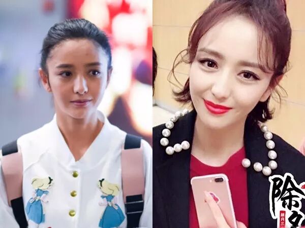 ▲发际线也比较高的唐嫣,左图虽然有大波浪显得头发蓬松,但还是难抵右侧光秃又圆润的大额头带来的冷冽感。而右图中的糖糖有一小缕刘海在右侧额前,很好地修饰了发际线过高的问题,看起来温婉不少。