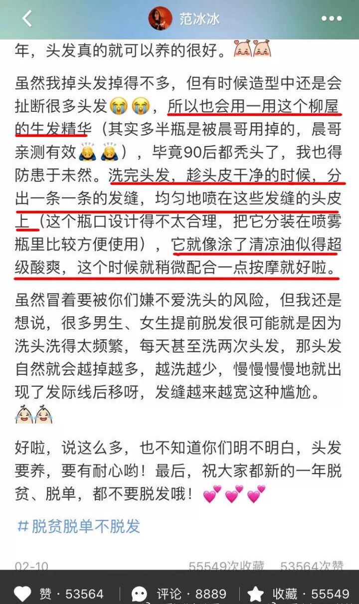 ▲范冰冰一直是发量巨大小队的领军人物,近日,她向网友们分享了自己发量丰盈的秘籍。除了适当减少洗头次数外,洗完头配合一款生发精华按摩头发也是重点。原来冰冰姐头发这么多,也是要用生发精华的呀!