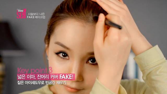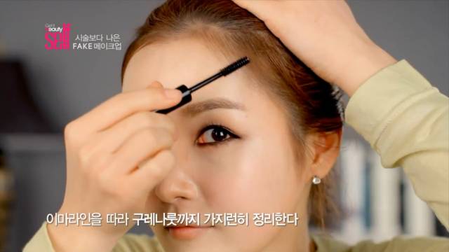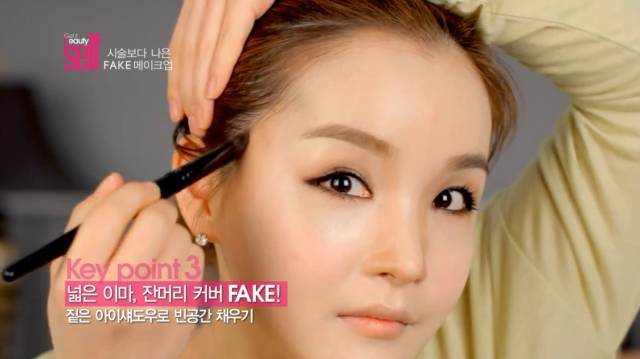 拿起染眉膏,在发际线处挑几簇短的胎毛轻轻往下梳,制造一些假的毛发,让额头看起来饱满自然。