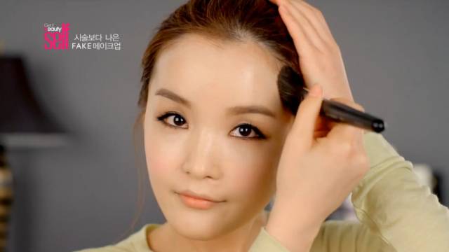 然后再用小的修容刷蘸取修容粉,涂抹在靠近头发的地方,和刚才大面积颜色有一个渐变的自然效果,这样更加逼真。