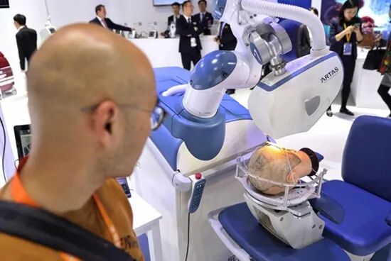 2019年11月6日,上海,一款植发手术辅助机器人首次亮相第二届进博会。该设备在一小时内可以帮助患者植发1500根。视觉中国供图