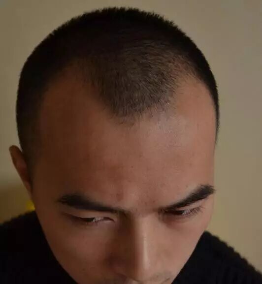 ▲图为齐先生植发前的照片(2016年10月植发),两边额角明显秃出,头顶中间的头发很稀少。