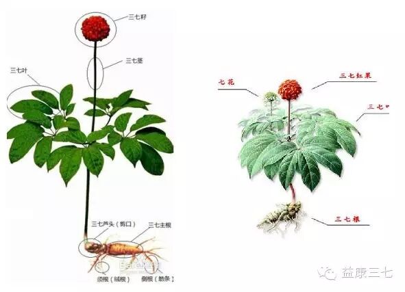 三七属五加科人参属植物;三七Panax notoginseng (Burk.)F.H.Chen 俗称:田七金不换、山漆、人参三七、参三七等,根据地域不同又称为云南三七、广西田七、文山三七;多年生草本,高30-60厘米,根茎短,初二三年内直立,以后逐渐倾斜生长,块根1个,倒圆锥形或圆柱形,表面常有疣状突起。茎直立,单生,不分枝。掌状复叶2-5枚,轮生于茎顶;叶柄长4-40厘米,无毛,基部具多数披针形或卵圆形的托叶状附属物;小叶5-7片,罕有3或者多达10枚的,叶片膜质,倒卵状椭圆形,基部圆形至宽楔形,略偏斜,边缘有细密锯齿,齿端有刚毛,两面脉上也疏生刚毛。伞形花序顶生,总花梗长15-30厘米,三七花小,多数两性花,有时候杂性,小花梗长1厘米,果时延长至于2.5厘米,基部具有多数鳞片,状苞片,花在80朵以上;花萼5裂,裂片三角形;花瓣5,卵圆形,较萼片长;雄蕊5,花药背着,内向纵裂;子房下位,2-3室。果近肾形,稀三棱,径约1厘米左右,熟时红色,种子1-3粒,白色,卵球形!主产区于云南文山、广西靖西、那坡等地区;