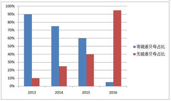 2013年-2016年浙贝母有硫、无硫比例