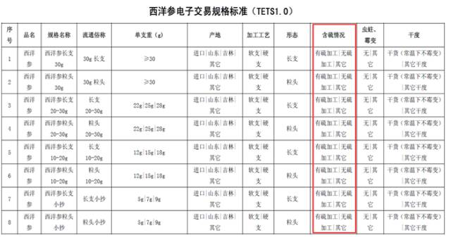首期202种中药材电子交易规格标准的属性项品名、规格名称、流通俗名各要素项目 (按照权重不同排列,共有项目包括大小及比例、残次片杂质,多数药材包括特有项目,如产地、颜色形态性状等),然后是统一化的虫蛀霉变项和干度项,凡是加工过程中有熏硫的项品种加含硫情况。