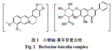 实验证明,黄芩苷与小檗碱水溶液混合后能迅速产生大量沉淀,通过紫外-可见分光光度法、核磁共振氢谱和碳谱、高分辨质谱等方法进行分析,发现黄芩苷与小檗碱以1∶1比例进行了酸碱中和反应,生成一种大分子复合物(图1)[5]。紫外光谱全波长扫描发现黄芩苷-小檗碱分子复合物具有新型共轭体系,最大吸收波长与母体原料相比发生波动;核磁数据显示黄芩苷的葡萄糖醛酸部位的氢和碳信号均发生显著位移。